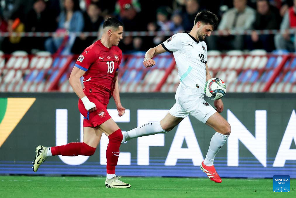 Austria's Marco Grull (R) vies with Serbia's Lazar Samardzic during the UEFA Nations League play-offs 2nd leg football match between Serbia and Austria in Belgrade, Serbia, March 23, 2025. (Photo by Predrag Milosavljevic/Xinhua)