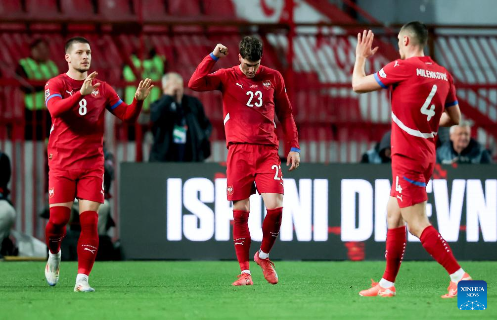 Serbia's Dusan Vlahovic (C) celebrates his goal during the UEFA Nations League play-offs 2nd leg football match between Serbia and Austria in Belgrade, Serbia, March 23, 2025. (Photo by Predrag Milosavljevic/Xinhua)