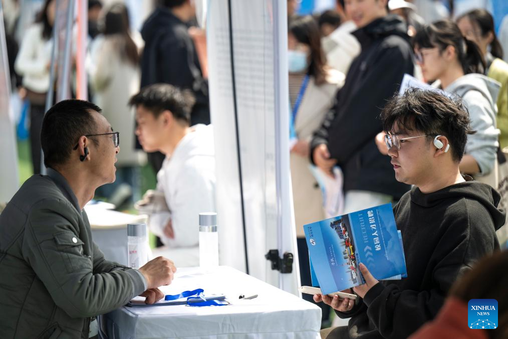 A job seeker (L) inquires a recruiter at a job fair at Hubei University of Technology in east China's Hubei Province, on April 1, 2025. (Xinhua/Wu Zhizun)