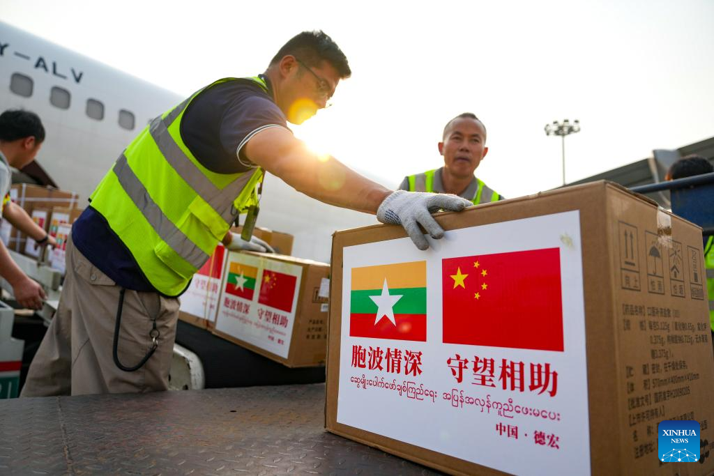 The Dehong Dai and Jingpo Autonomous Prefecture in Yunnan donated a batch of medical supplies worth more than 240,000 yuan (around 33,011.76 U.S. dollars) on Tuesday to support earthquake relief work in Myanmar. (Xinhua/Chen Xinbo)