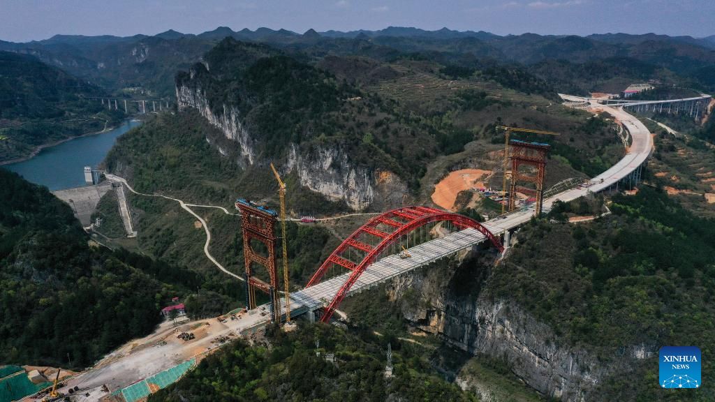 An aerial drone photo taken on April 1, 2025 shows the construction site of the Machanghe grand bridge along the Guiyang-Pingtang Expressway in southwest China's Guizhou Province.