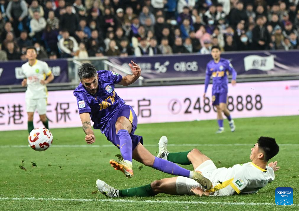 Alberto Quiles (L) of Tianjin Jinmen Tiger shoots to score during the 4th round match between Tianjin Jinmen Tiger and Beijing Guoan at the 2025 season Chinese Football Super League (CSL) in north China's Tianjin, April 2, 2025. (Xinhua/Sun Fanyue)