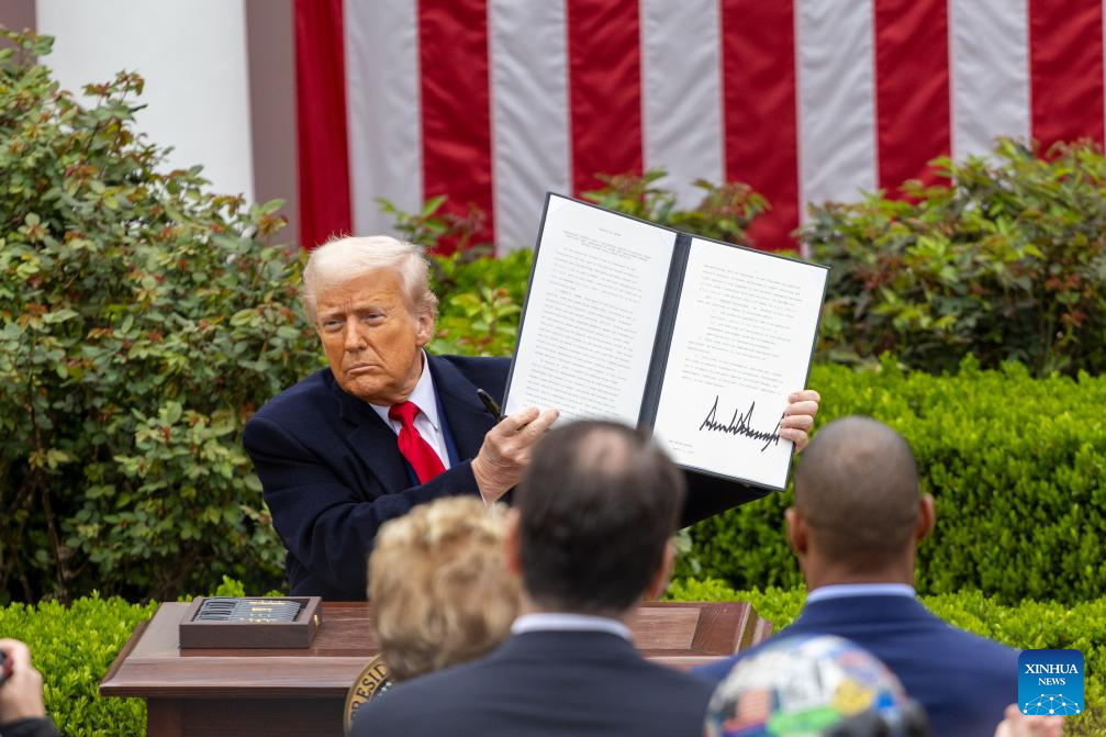 Amid widespread opposition, U.S. President Donald Trump on Wednesday signed an executive order on the so-called "reciprocal tariffs," imposing a 10-percent "minimum baseline tariff" and higher rates on certain trading partners. (Xinhua/Hu Yousong)
