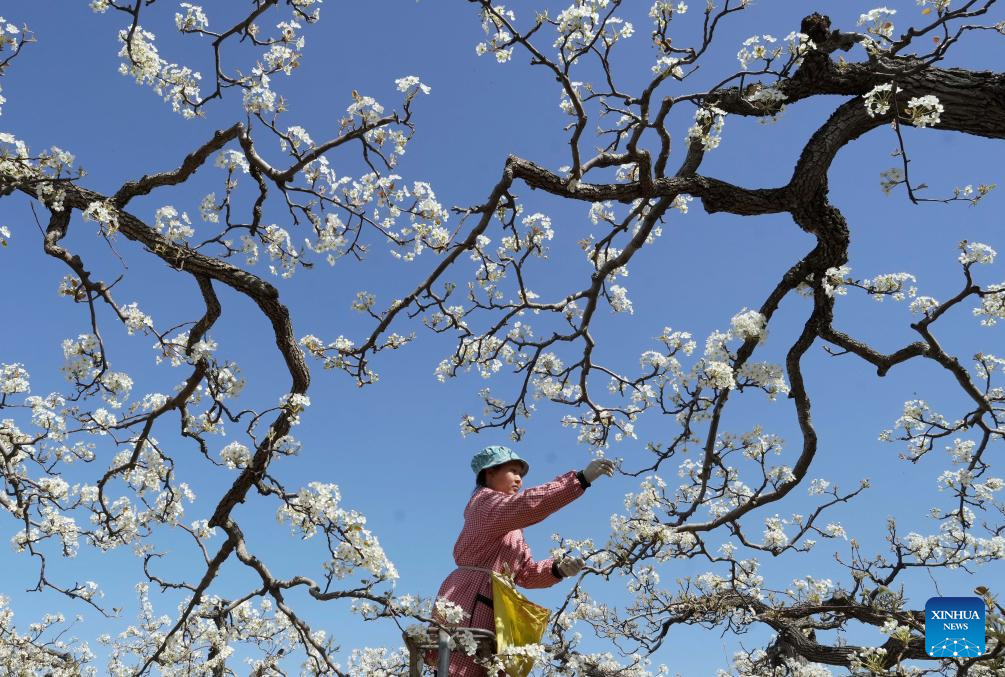 A farmer performs flower thinning at a pear garden in Fanzhuang Town, Zhaoxian County, north China's Hebei Province, on April 2, 2025. (Xinhua/Yang Shiyao)