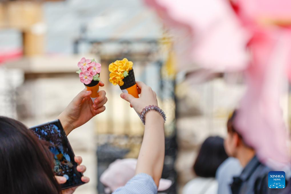 Tourists take photos of crabapple blossom-inspired ice cream at the Wudadao historical urban area in north China's Tianjin, April 4, 2025.
