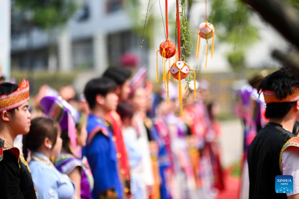 Embroidered balls are seen in Hechi University in Hechi, south China's Guangxi Zhuang Autonomous Region, March 26, 2025. Guangxi Zhuang Autonomous Region is the autonomous region with the largest population of ethnic minorities in China, with multiple ethnic groups such as Zhuang, Yao, Miao, and Dong who have lived there for generations. Throwing embroidered balls is a traditional sport that Guangxi people enjoy, carrying a profound folk heritage. In Zhuang culture, embroidered ball is a symbol of love.