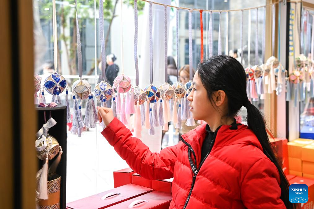 A customer chooses embroidered balls at a canival of the Sanyuesan Festival in Nanning, south China's Guangxi Zhuang Autonomous Region, March 31, 2025. Guangxi Zhuang Autonomous Region is the autonomous region with the largest population of ethnic minorities in China, with multiple ethnic groups such as Zhuang, Yao, Miao, and Dong who have lived there for generations. Throwing embroidered balls is a traditional sport that Guangxi people enjoy, carrying a profound folk heritage. In Zhuang culture, embroidered ball is a symbol of love.