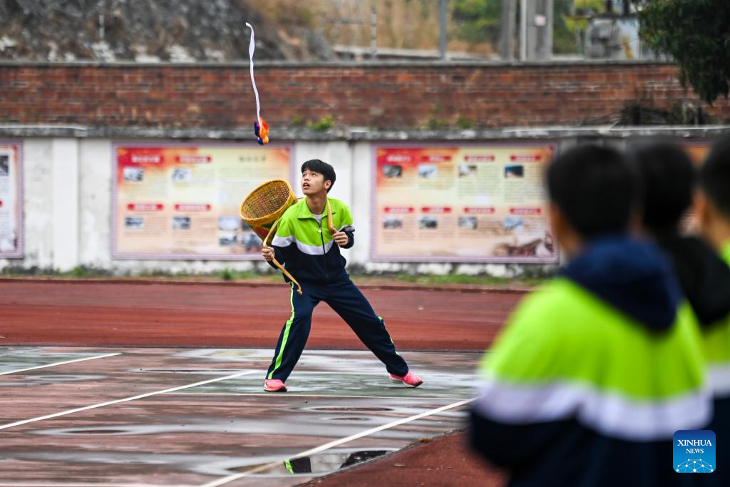 A student catches a embroidered ball with a basket in Yulin Ethnic Middle School in Yulin, south China's Guangxi Zhuang Autonomous Region, Feb. 19, 2025. Guangxi Zhuang Autonomous Region is the autonomous region with the largest population of ethnic minorities in China, with multiple ethnic groups such as Zhuang, Yao, Miao, and Dong who have lived there for generations. Throwing embroidered balls is a traditional sport that Guangxi people enjoy, carrying a profound folk heritage. In Zhuang culture, embroidered ball is a symbol of love.
