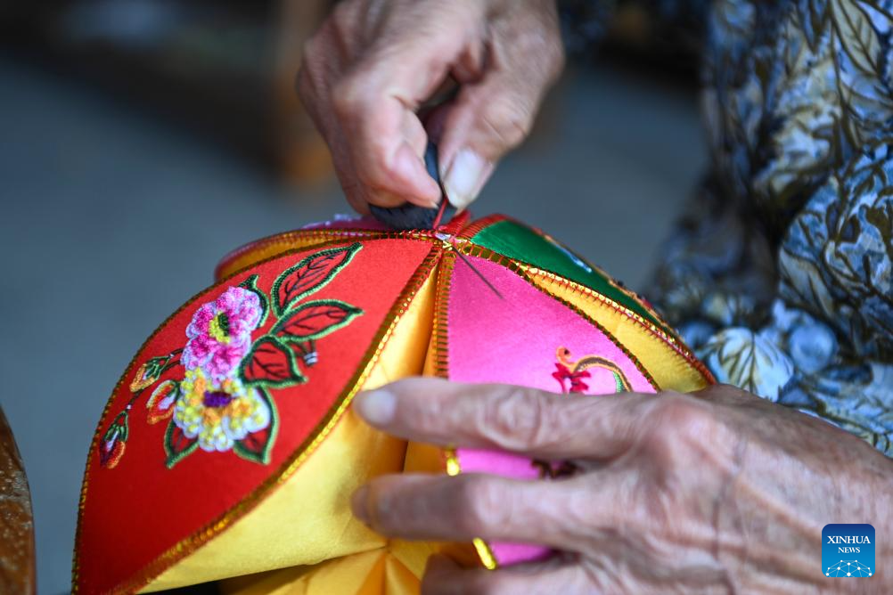 Jingxi City, located in the southwest of Guangxi, has a long history of making embroidered balls. In Jiuzhou Village, Jingxi, almost every household can make embroidered balls. At present, the development model of Jingxi embroidered ball has shifted from a traditional small-scale development model to market-oriented and industrialized development model. Nowadays, Jingxi embroidered ball, as a characteristic tourist souvenir, has been sold all over the world. (Xinhua/Cao Yiming)