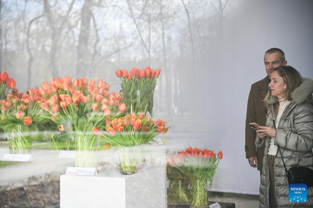 People visit the 15th Tulip Exhibition held at Wilanow Palace in Warsaw, Poland on April 5, 2025. The event runs through April 6. (Photo by Aleksy Witwicki/Xinhua)