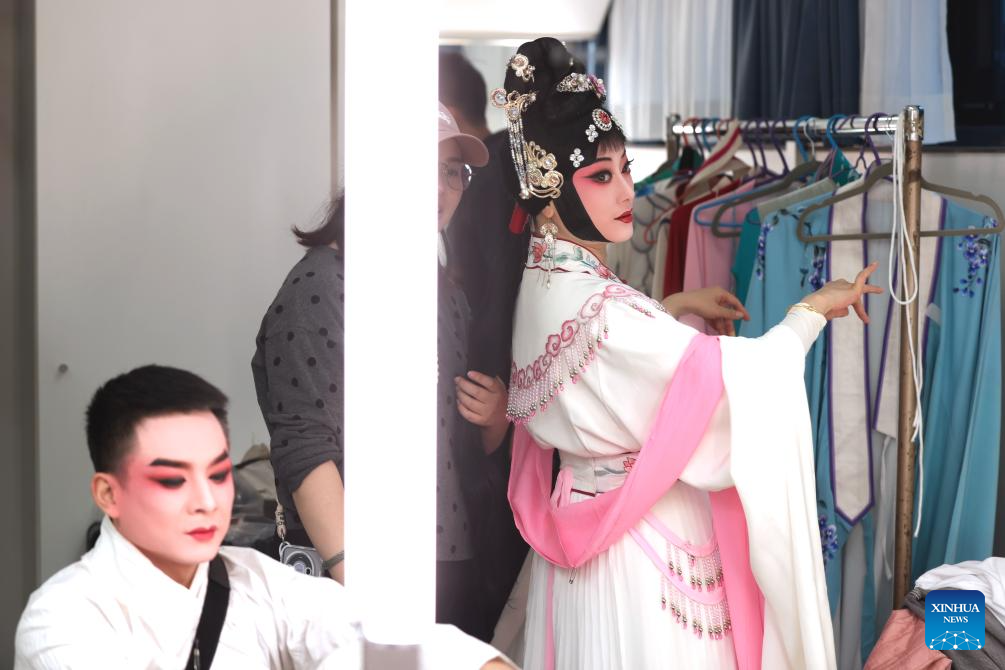 Artists prepare before the performance of the traditional Chinese Wu Opera "The Legend of the White Snake" in Vienna, Austria, April 5, 2025. The Chinese Opera Season 2025 opened here on Saturday night with a performance of the traditional Wu Opera "The Legend of the White Snake", marking the beginning of a series of Chinese operatic performances in the Austrian capital. (Xinhua/Zhao Dingzhe)