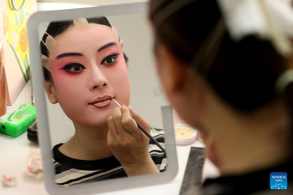 An artist puts on makeup before the performance of the traditional Chinese Wu Opera "The Legend of the White Snake" in Vienna, Austria, April 5, 2025. The Chinese Opera Season 2025 opened here on Saturday night with a performance of the traditional Wu Opera "The Legend of the White Snake", marking the beginning of a series of Chinese operatic performances in the Austrian capital. (Xinhua/Zhao Dingzhe)