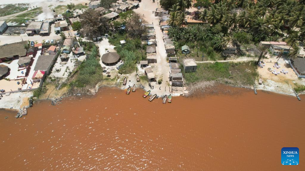 An aerial drone photo taken on April 6, 2025 shows a view of the Lake Retba, also known as the Lac Rose, near Dakar, Senegal. (Xinhua/Si Yuan)