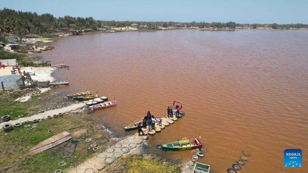 Tourists ride a sightseeing boat at the Lake Retba, also known as the Lac Rose, near Dakar, Senegal, April 6, 2025. (Xinhua/Si Yuan)