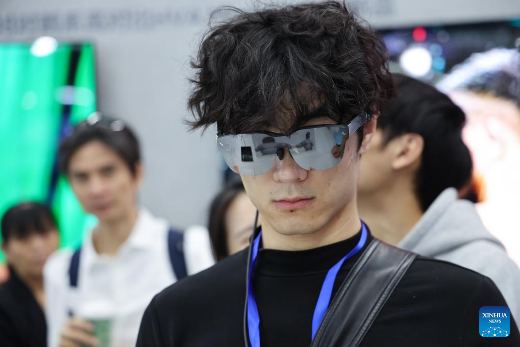 A visitor tries on a pair of intelligent glasses at the 13th China Electronic Information Expo (CITE 2025) in Shenzhen, south China's Guangdong Province, April 9, 2025. The expo kicked off at Shenzhen Convention & Exhibition Center (Futian) on Wednesday. Themed on "Technology Leading, Innovation Gathering in Shenzhen", the exhibition focuses on cutting-edge key areas such as intelligent terminals, optoelectronic displays, artificial intelligence, big data storage, basic components, and low-altitude economy, attracting more than a thousand companies to participate. (Xinhua/Liang Xu)