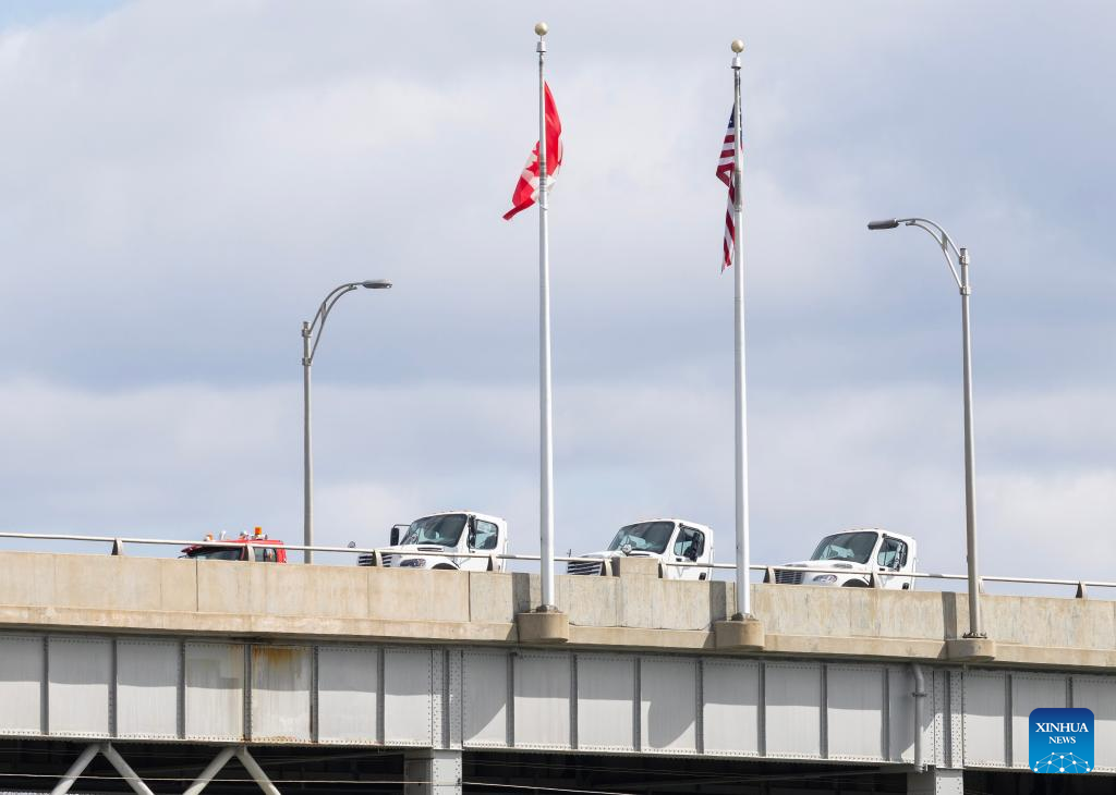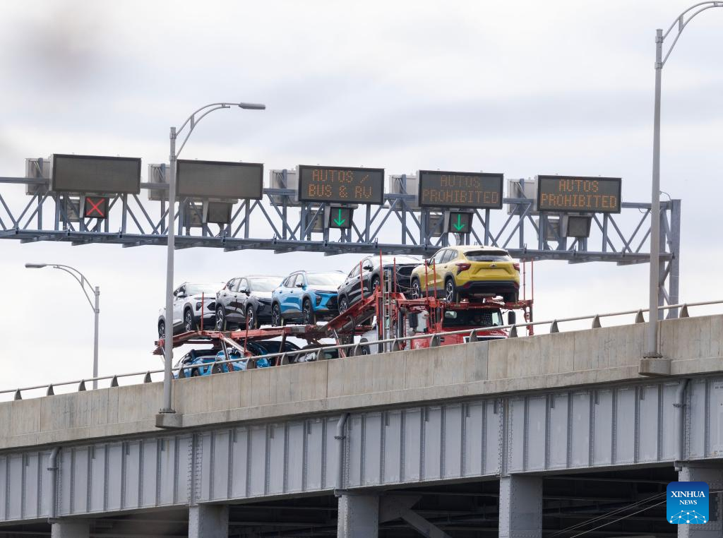 An auto transport carrier crosses the Lewiston-Queenston Bridge on its way to Canada, as seen from the Canadian side in Niagara Falls, Ontario, Canada, on April 9, 2025. Canadian Finance Minister François-Philippe Champagne on Tuesday confirmed that Canada's new countermeasures announced last week in response to the U.S. tariffs on the Canadian auto industry will come into force at 12:01 a.m. EDT on Wednesday, April 9. (Photo by Zou Zheng/Xinhua)