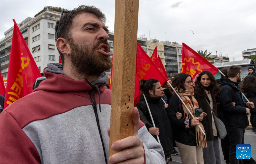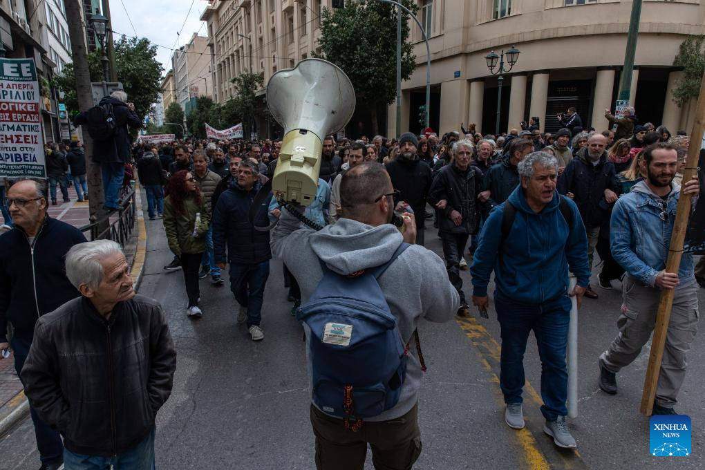 Strikers take part in a demonstration in Athens, Greece, on April 9, 2025. Greece was hit by a 24-hour strike on Wednesday, called by trade unions to protest against inadequate salary increases amid the high cost of living. (Xinhua/Marios Lolos)