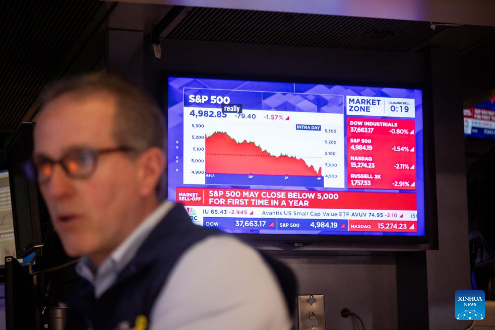 NEW YORK, April 8 (Xinhua) -- U.S. stocks closed sharply lower on Tuesday, after the White House confirmed plans to move forward with a dramatic increase in tariffs on Chinese goods.