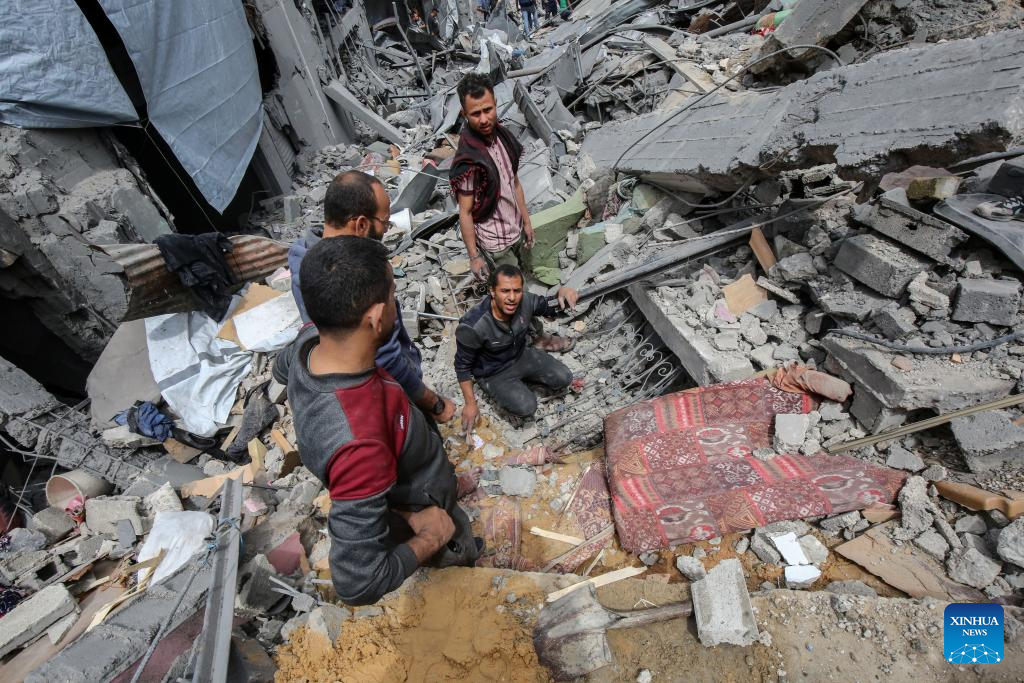 People search for survivors among the rubble of destroyed buildings in the Shuja'iyya neighborhood, east of Gaza City, on April 9, 2025. At least 29 Palestinians were killed and more than 50 others injured on Wednesday in an Israeli airstrike that hit a residential block in the Shuja'iyya neighborhood, Hamas said in a statement. (Photo by Rizek Abdeljawad/Xinhua)