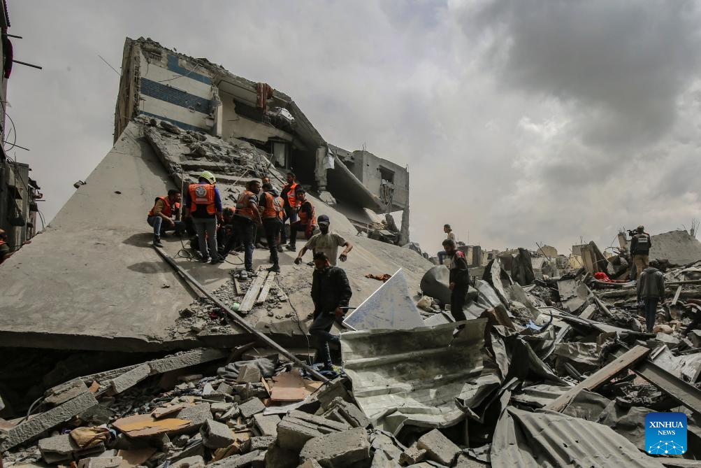 Rescuers search for survivors among the rubble of destroyed buildings in the Shuja'iyya neighborhood, east of Gaza City, on April 9, 2025. At least 29 Palestinians were killed and more than 50 others injured on Wednesday in an Israeli airstrike that hit a residential block in the Shuja'iyya neighborhood, Hamas said in a statement. (Photo by Rizek Abdeljawad/Xinhua)