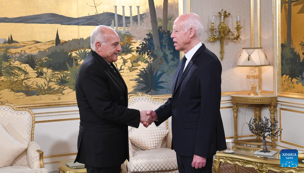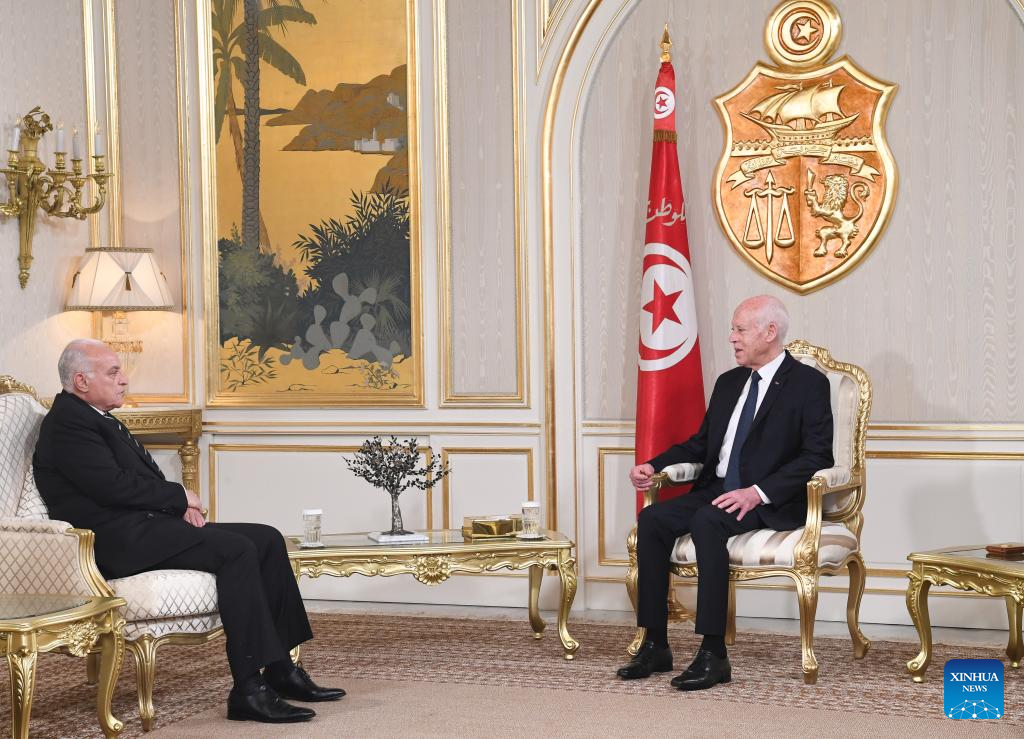 TUNIS, April 9 (Xinhua) -- Tunisian President Kais Saied met with Algerian Foreign Minister Ahmed Attaf in Tunis on Wednesday, where both sides reaffirmed their commitment to strengthening bilateral ties and cooperation.