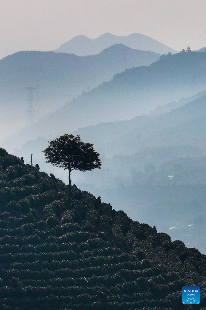 An aerial drone photo taken on April 7, 2025 shows farmers picking tea leaves at a tea garden in Anji County, east China's Zhejiang Province. (Photo by Xu Changyin/Xinhua)