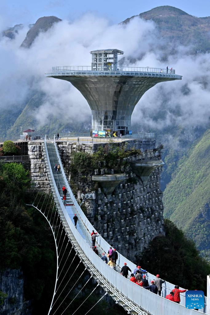 Tourists walk on a skywalk at Wuxiakou scenic area in Badong County, central China's Hubei Province, April 10, 2025. (Photo by Song Wen/Xinhua)