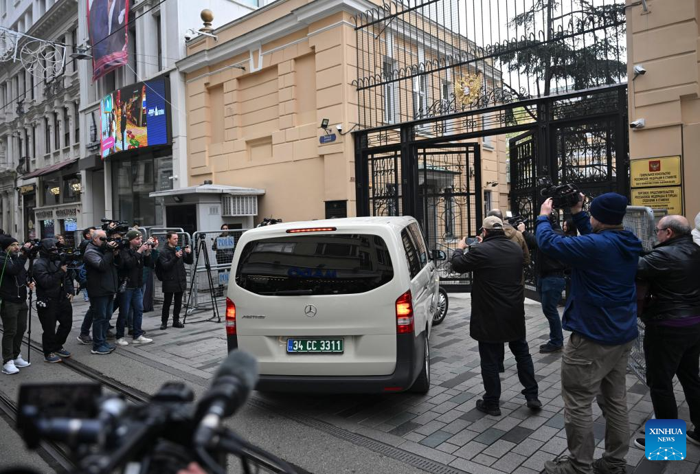 A vehicle carrying U.S. delegates prepares to enter the Russian consulate in Istanbul, Türkiye, April 10, 2025. The United States and Russia on Thursday finished their second round of talks on restoring diplomatic missions in Türkiye's largest city Istanbul. (Xinhua/Liu Lei)