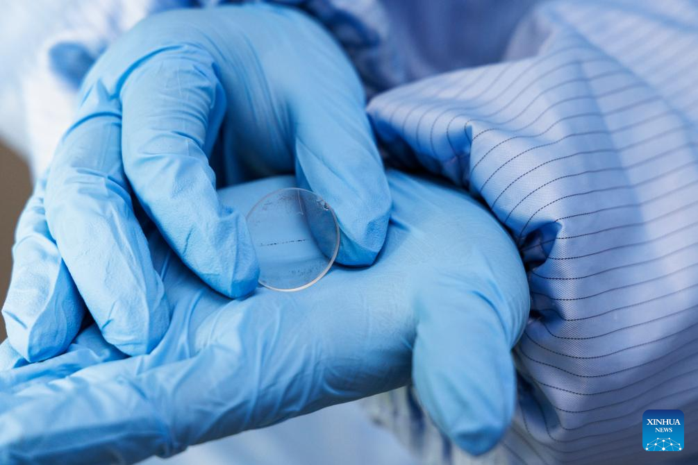 A researcher displays the lunar sample to be tested at the Nano Secondary Ion Mass Spectrometer Laboratory (NanoSIMS Lab) of the Institute of Geology and Geophysics of the Chinese Academy of Sciences in Beijing, capital of China, April 8, 2025.