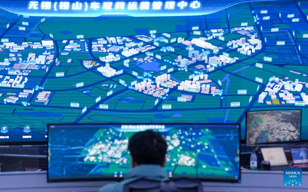 A staff member works at a car networking operation and management center in Wuxi, east China's Jiangsu Province, March 31, 2025. In recent years, Jiangsu Province has actively promoted the high-quality development of the Internet of Things, striving to build up an industrial innovation center with global influence.