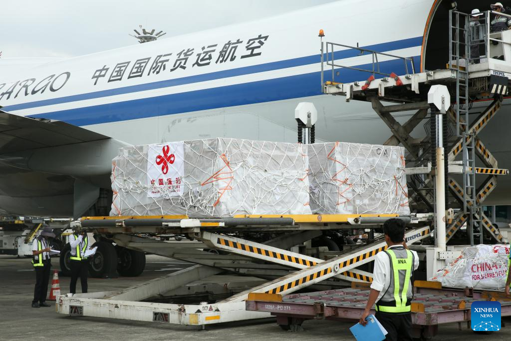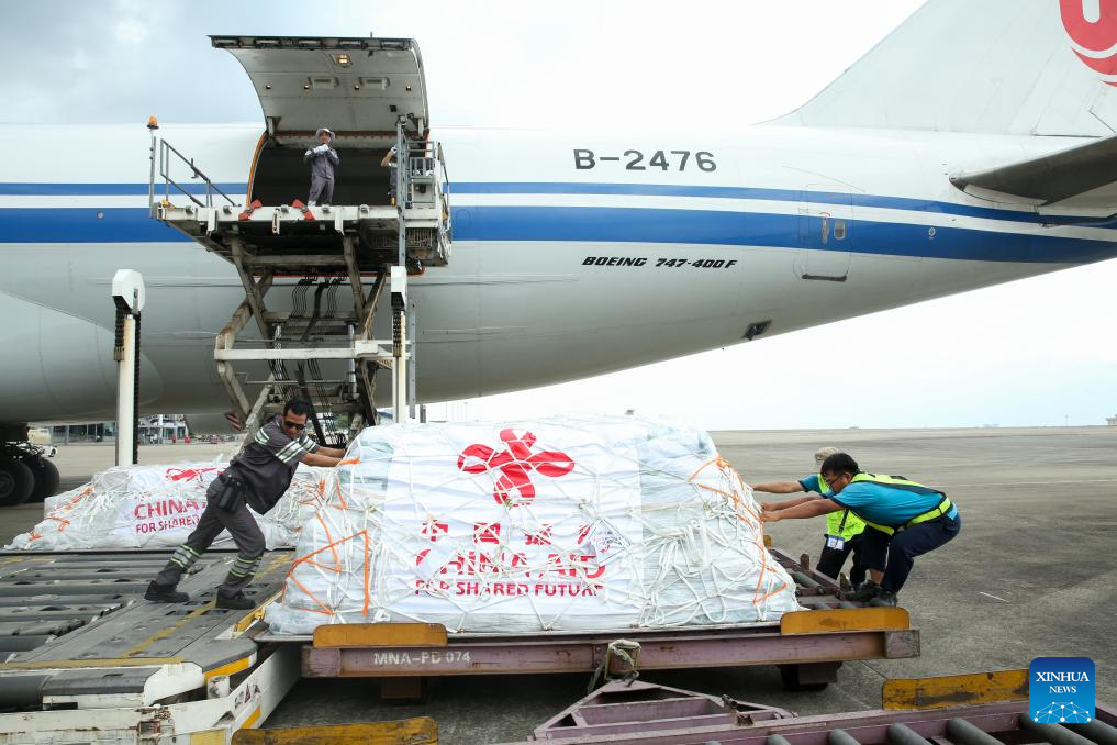 The sixth batch of emergency humanitarian aid dispatched by the Chinese government arrives at Yangon International Airport in Myanmar on April 11, 2025. The aid supplies include 26 tents, 2,000 sets of single-person outdoor cooking equipment, 10,000 solar lamps, 38,880 bars of soap, 38,880 bottles of shower gel, 38,880 bottles of shampoo, 38,880 tubes of toothpaste, 38,880 sets of toothbrushes, and 38,880 bags of laundry detergent, with a total weight of over 91 tons. (Xinhua/Myo Kyaw Soe)