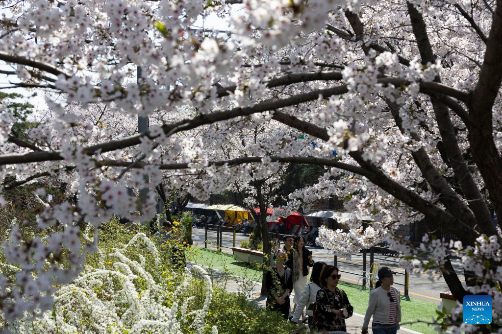 People walk under cherry blossoms at Yeouido Park in Seoul, South Korea, April 11, 2025. (Photo by Jun Hyosang/Xinhua)