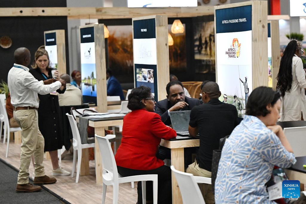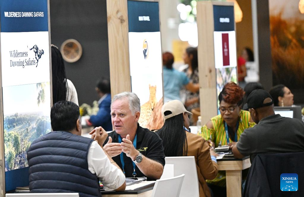 People communicate during the World Travel Market (WTM) Africa 2025 in Cape Town, South Africa, April 11, 2025. The three-day WTM Africa 2025 kicked off here on April 9, gathering approximately 5,752 tourism industry professionals from about 99 countries. (Photo by Xabiso Mkhabela/Xinhua)