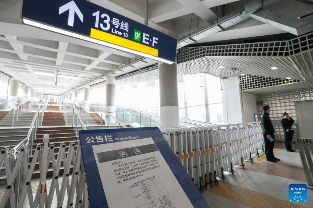 A notice posted at Xizhimen Station of Beijing Subway announces the suspension of some rail lines due to strong winds, in Beijing, capital of China, April 12, 2025. Many parts in northern China are experiencing gale-force winds and temperature drops on Saturday. (Xinhua/Ju Huanzong)