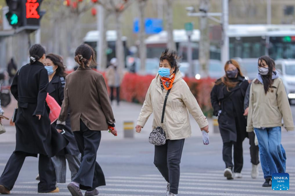 People walk on a street in Beijing, capital of China, April 12, 2025. Many parts in northern China are experiencing gale-force winds and temperature drops on Saturday. (Xinhua/Jiang Han)