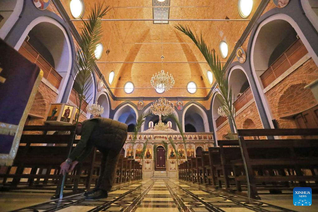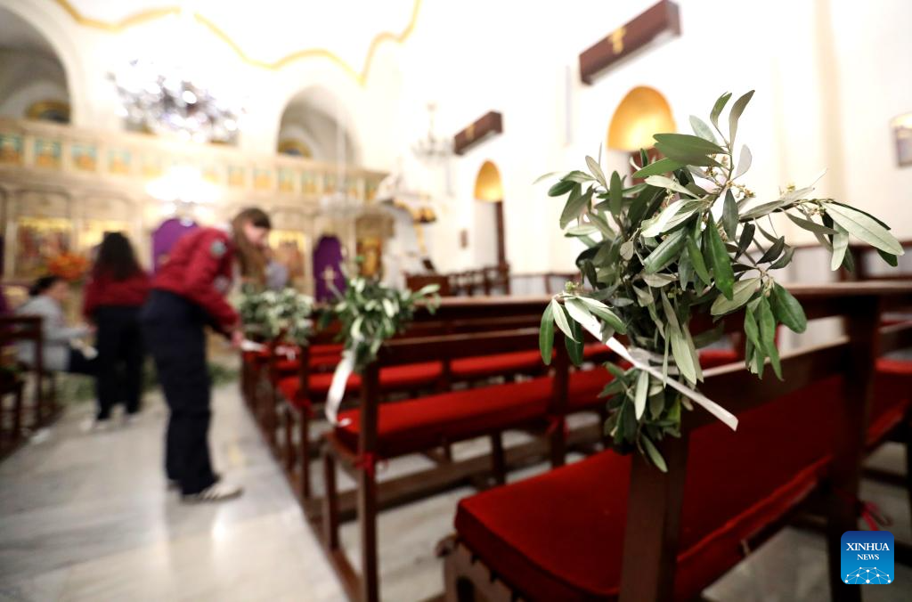 People decorate the church in preparation for Palm Sunday in Beirut, Lebanon, April 11, 2025. Palm Sunday, a Christian feast that falls on the Sunday before Easter, marks the beginning of the Holy Week. (Xinhua/Bilal Jawich)