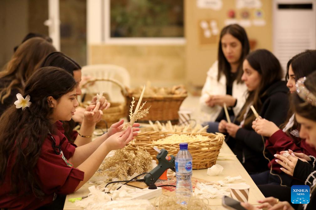 People prepare candles for Palm Sunday in Beirut, Lebanon, April 11, 2025. Palm Sunday, a Christian feast that falls on the Sunday before Easter, marks the beginning of the Holy Week. (Xinhua/Bilal Jawich)