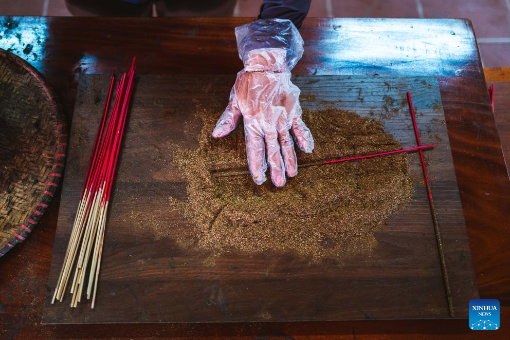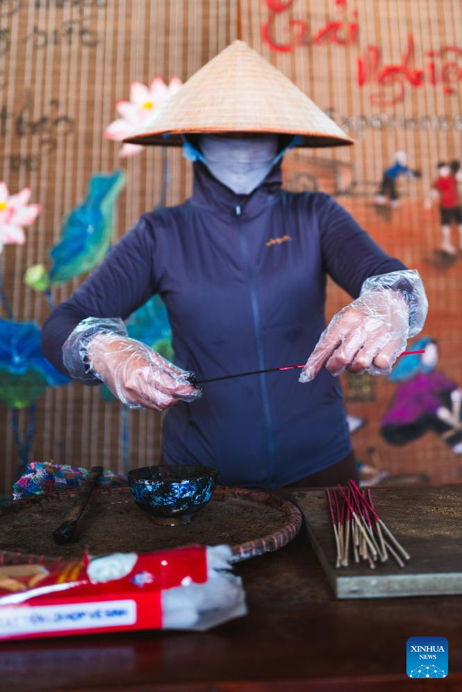 A villager demonstrates how to make incense sticks in Quang Phu Cau Village, Vietnam, March 24, 2025. Quang Phu Cau Village, 35 kilometers south of Hanoi, has a long tradition of making incense sticks.