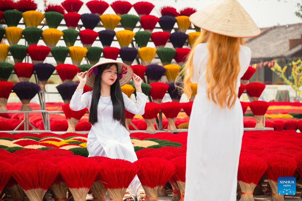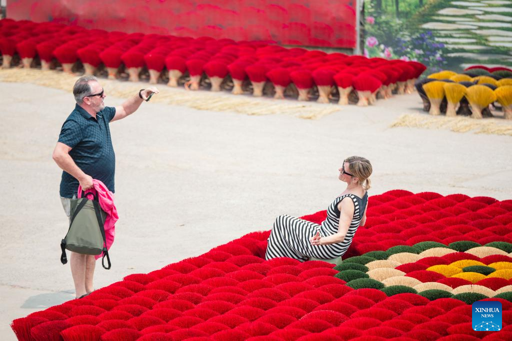 Tourists pose for photos amid bundles of incense sticks in Quang Phu Cau Village, Vietnam, March 24, 2025. Quang Phu Cau Village, 35 kilometers south of Hanoi, has a long tradition of making incense sticks.