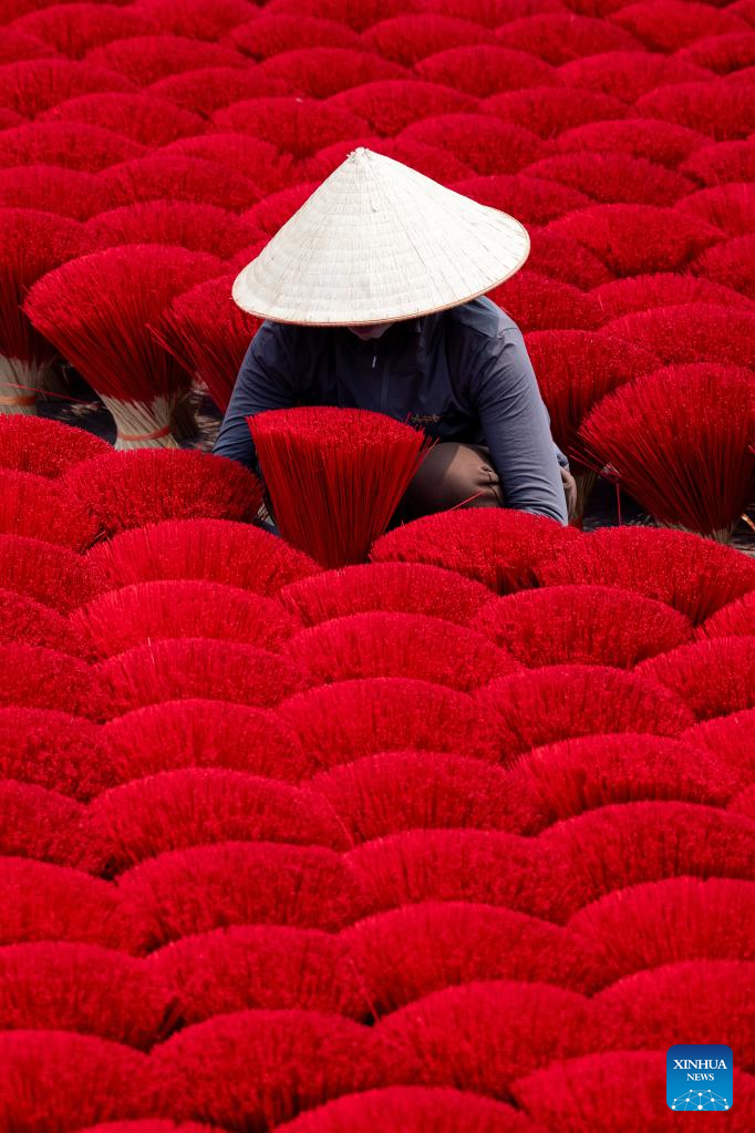 This photo shows bundles of incense sticks placed at a courtyard in Quang Phu Cau Village, Vietnam, March 24, 2025. Quang Phu Cau Village, 35 kilometers south of Hanoi, has a long tradition of making incense sticks.