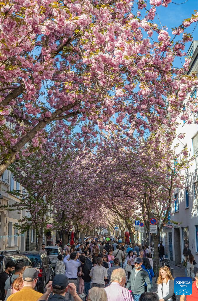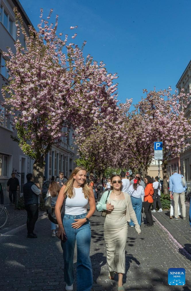 People enjoy blooming cherry blossoms in Bonn, Germany, April 12, 2025. (Xinhua/Zhang Fan)