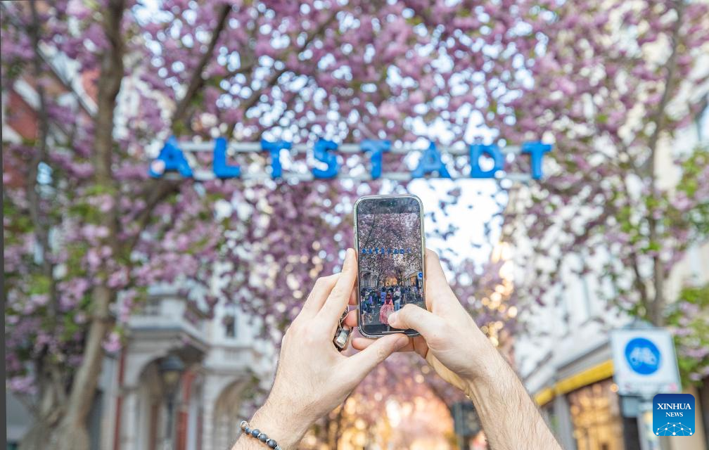 A tourist takes photos of blooming cherry blossoms in Bonn, Germany, April 12, 2025. (Xinhua/Zhang Fan)