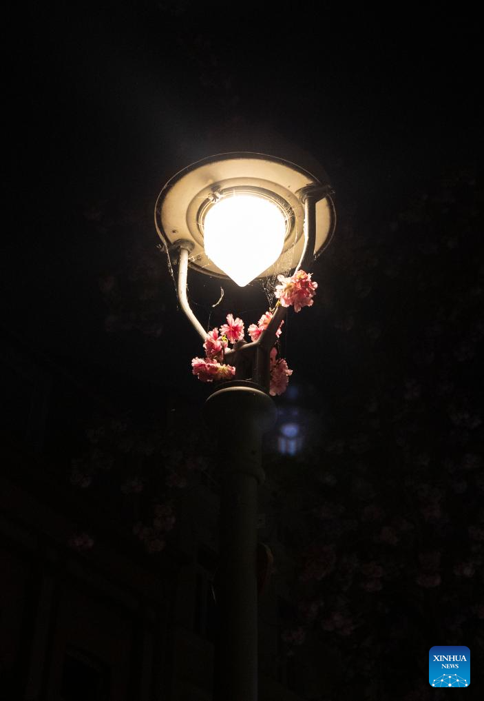 A cherry blossom branch is seen on a street light in Bonn, Germany, April 12, 2025. (Xinhua/Zhang Fan)