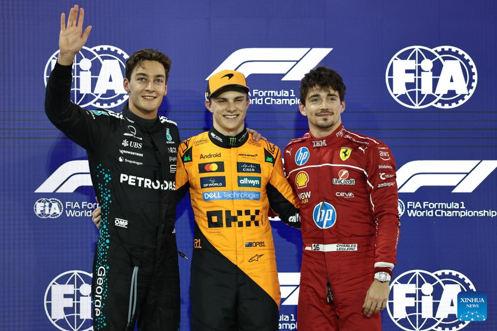 Mclaren's driver Oscar Piastri (C) of Australia, Mercedes' driver George Russell (L) of Britain and Ferrari's driver Charles Leclerc of Monaco pose after the qualifying session of the Formula One Bahrain Grand Prix at the Bahrain International Circuit in Sakhir, Bahrain, on April 12, 2025. (Photo by Qian Jun/Xinhua)