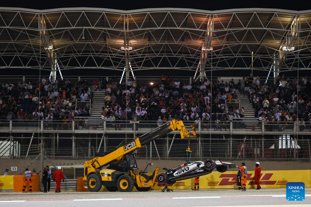 A crane lifts the car of Haas's driver Esteban Ocon of France after crashing during the qualifying session of the Formula One Bahrain Grand Prix at the Bahrain International Circuit in Sakhir, Bahrain, on April 12, 2025. (Photo by Qian Jun/Xinhua)