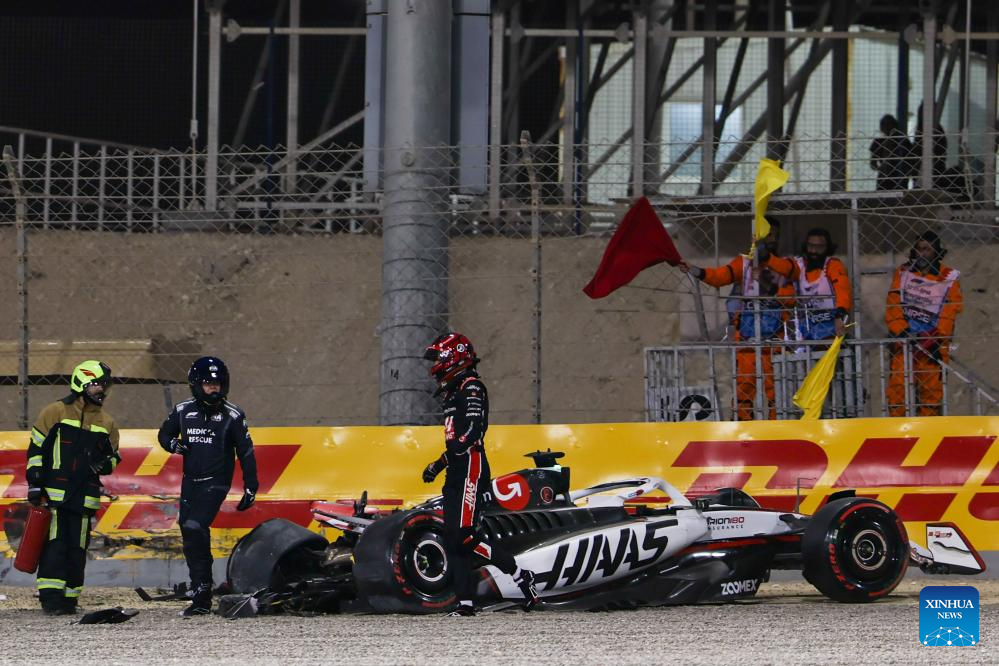 Haas' driver Esteban Ocon of France gets out of the car after crashing during the qualifying session of the Formula One Bahrain Grand Prix at the Bahrain International Circuit in Sakhir, Bahrain, on April 12, 2025. (Photo by Qian Jun/Xinhua)