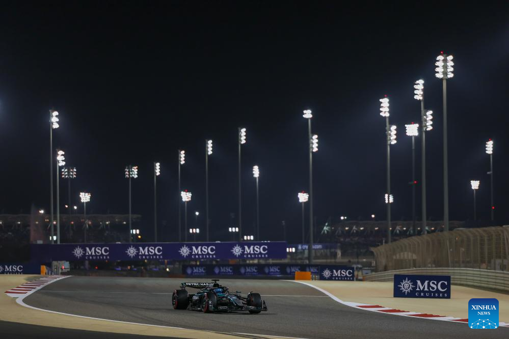 Mercedes' driver George Russell of Britain drives during the qualifying session of the Formula One Bahrain Grand Prix at the Bahrain International Circuit in Sakhir, Bahrain, on April 12, 2025. (Photo by Qian Jun/Xinhua)