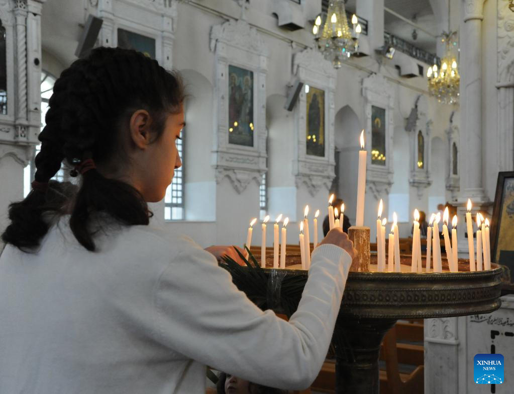 A girl lights a candle during a Palm Sunday mass at a church in Damascus, Syria, April 13, 2025. Syrian Christians gathered in churches to mark Palm Sunday, a Christian feast that falls on Sunday ahead of Easter. (Photo by Ammar Safarjalani/Xinhua)