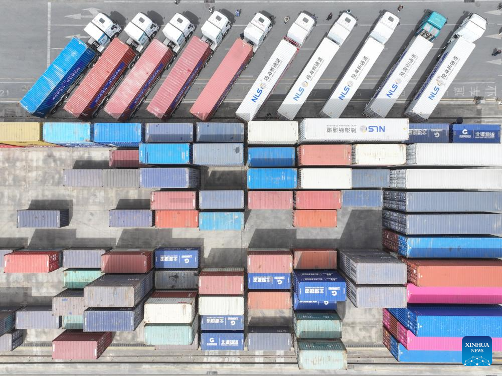 An aerial drone photo taken on April 14, 2025 shows hydrogen-powered heavy-duty trucks awaiting departure from the dry port of the New International Land-Sea Trade Corridor in Chongqing, southwest China. China's first cross-region hydrogen heavy-duty truck route was launched on Monday, marking a milestone in terms of advancing hydrogen energy development in China's western regions. The route, now operational for regular freight services via hydrogen-powered heavy-duty trucks, spans 1,150 kilometers from southwest China's Chongqing Municipality to Qinzhou Port in south China's Guangxi Zhuang Autonomous Region, passing through southwestern Guizhou Province. (Xinhua/Tang Yi)