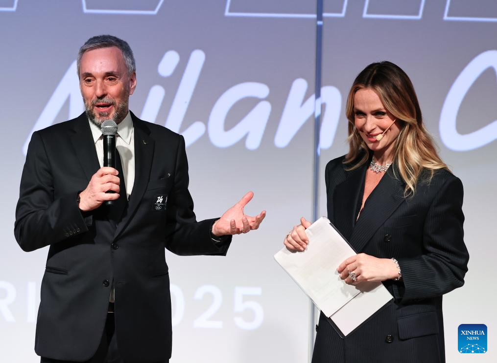Former Italian cross-country skier Stefania Belmondo (L) and fencing paralympic champion Beatrice Vio attend the unveiling ceremony of the torches for Milano Cortina 2026 Olympic and Paralympic Winter Games in Milan, Italy, April 14, 2025. (Xinhua/Li Jing)